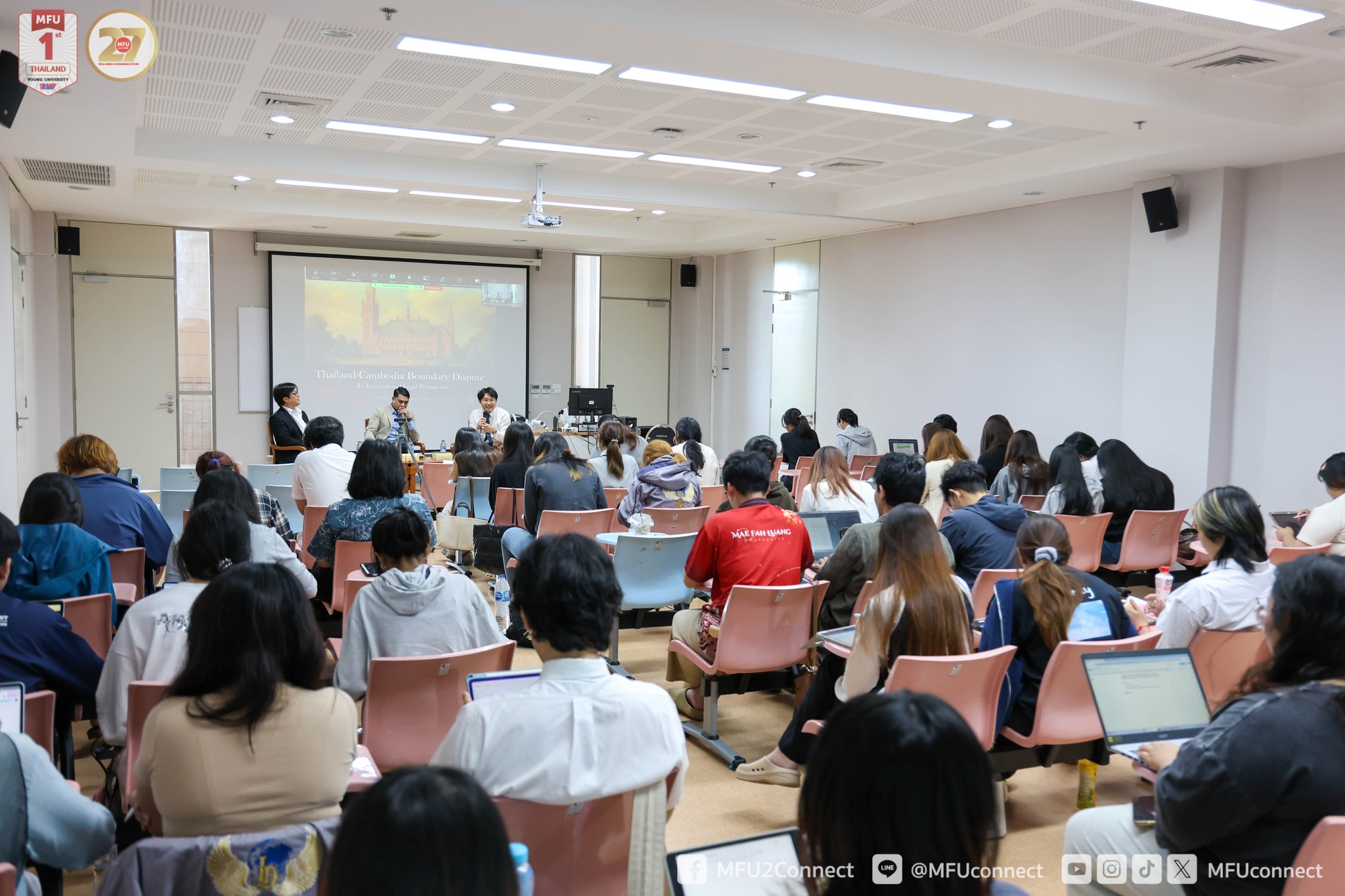 The event featured two distinguished speakers: Dr.Nichan Singhaputargun from the School of Social Innovation, who presented from the perspective of Peace Studies, analyzing the root causes and dynamics of the conflict; and Mr. Phetnapat Srivuddhiyaprabha from the School of Law, who examined the issue through International Law, focusing on the role of treaties and the International Court of Justice. The session was moderated by Dr.Anuthep Sooksriwong from the School of Law.