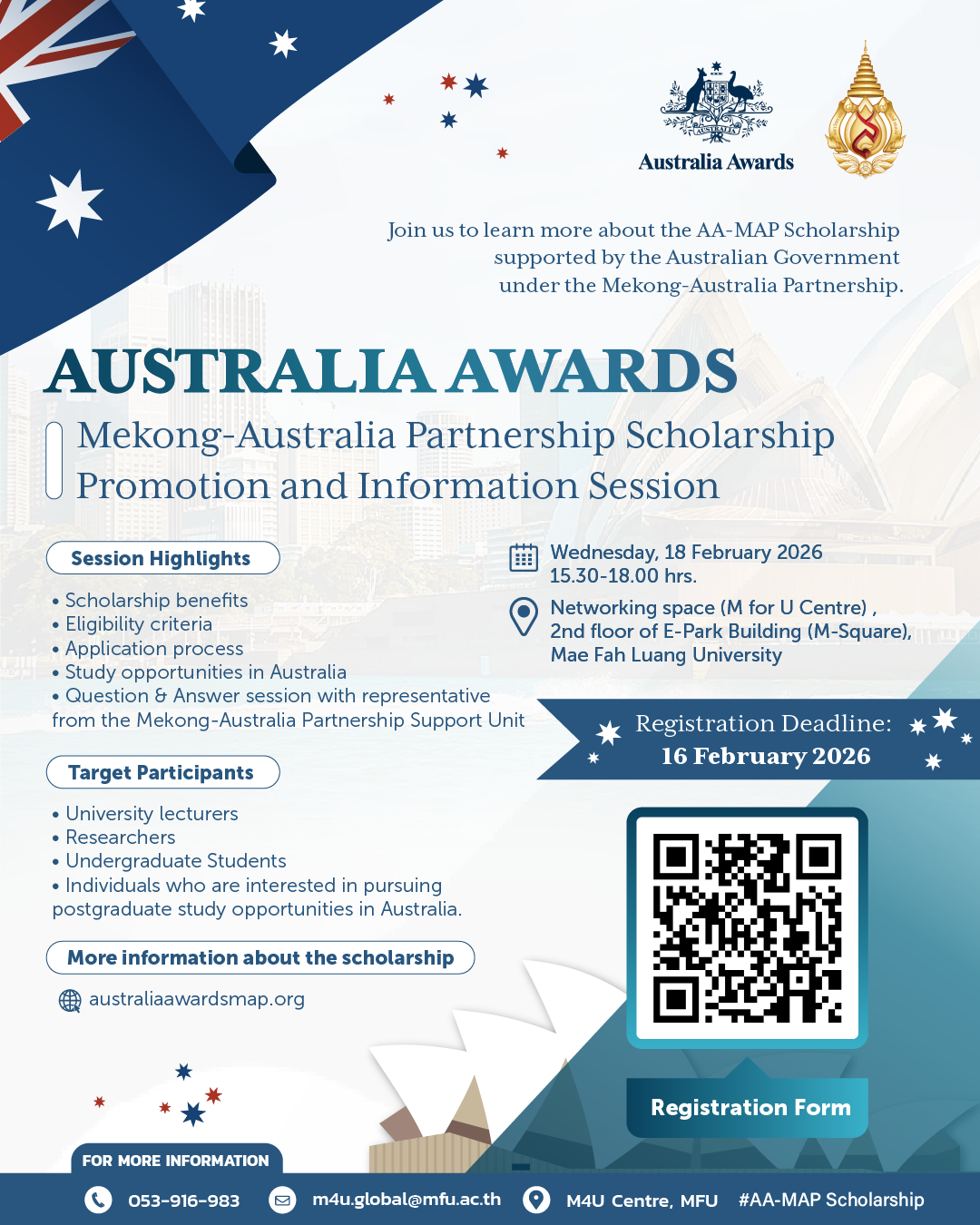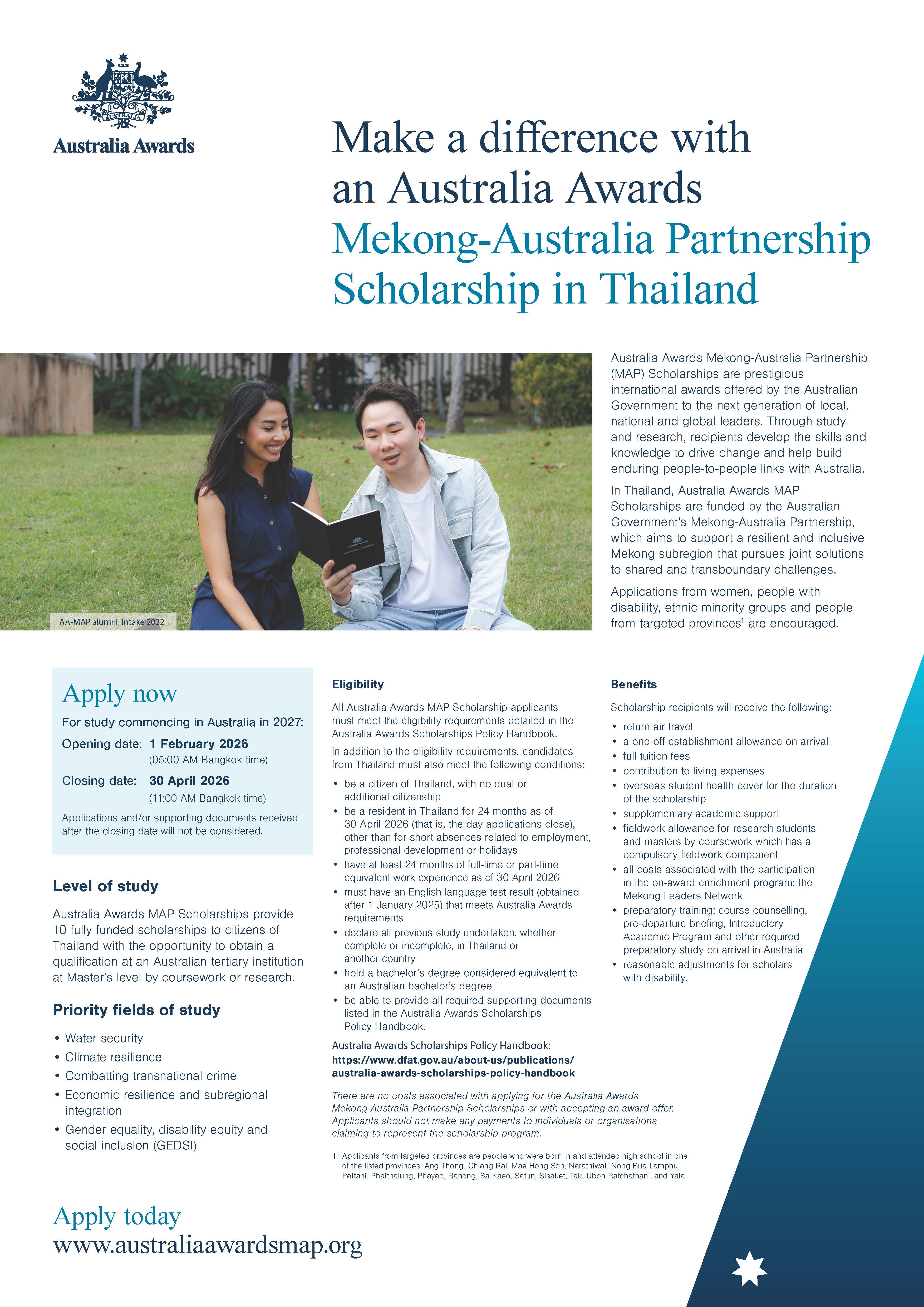 Australia Awards Scholarships are prestigious international awards offered by the Australian Government to the next generation of local, national, and global leaders. Through study and research, recipients develop the skills and knowledge to drive change and help build enduring people-to-people links with Australia. In Thailand, Australia Awards Scholarships are funded by the Australian Government’s Mekong-Australia Partnership (MAP), which aims to support a resilient and inclusive Mekong subregion that pursues joint solutions to shared and transboundary challenges.
