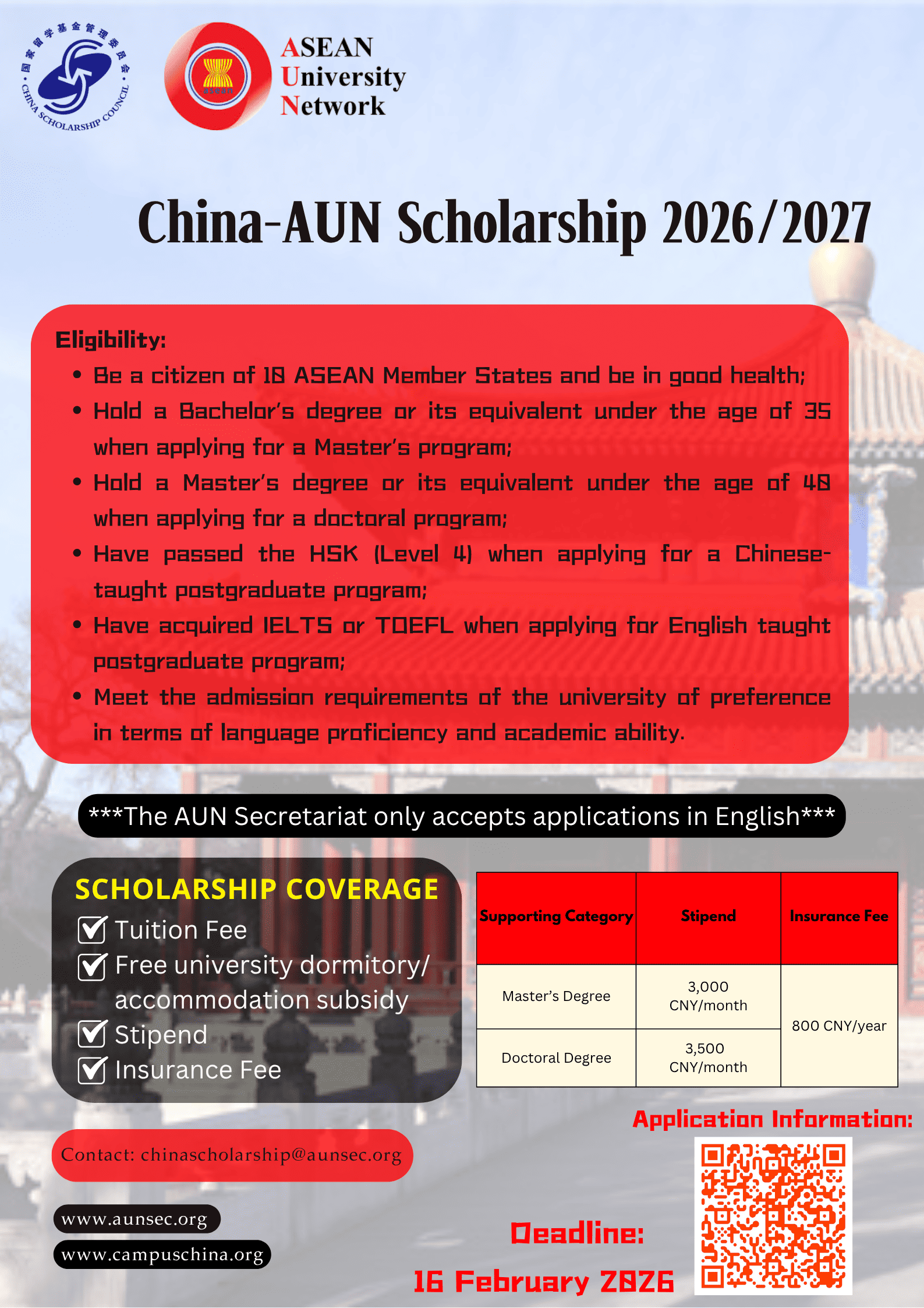 1. China–AUN Scholarship 2026/2027 (Chinese Government Scholarship – AUN Programme)