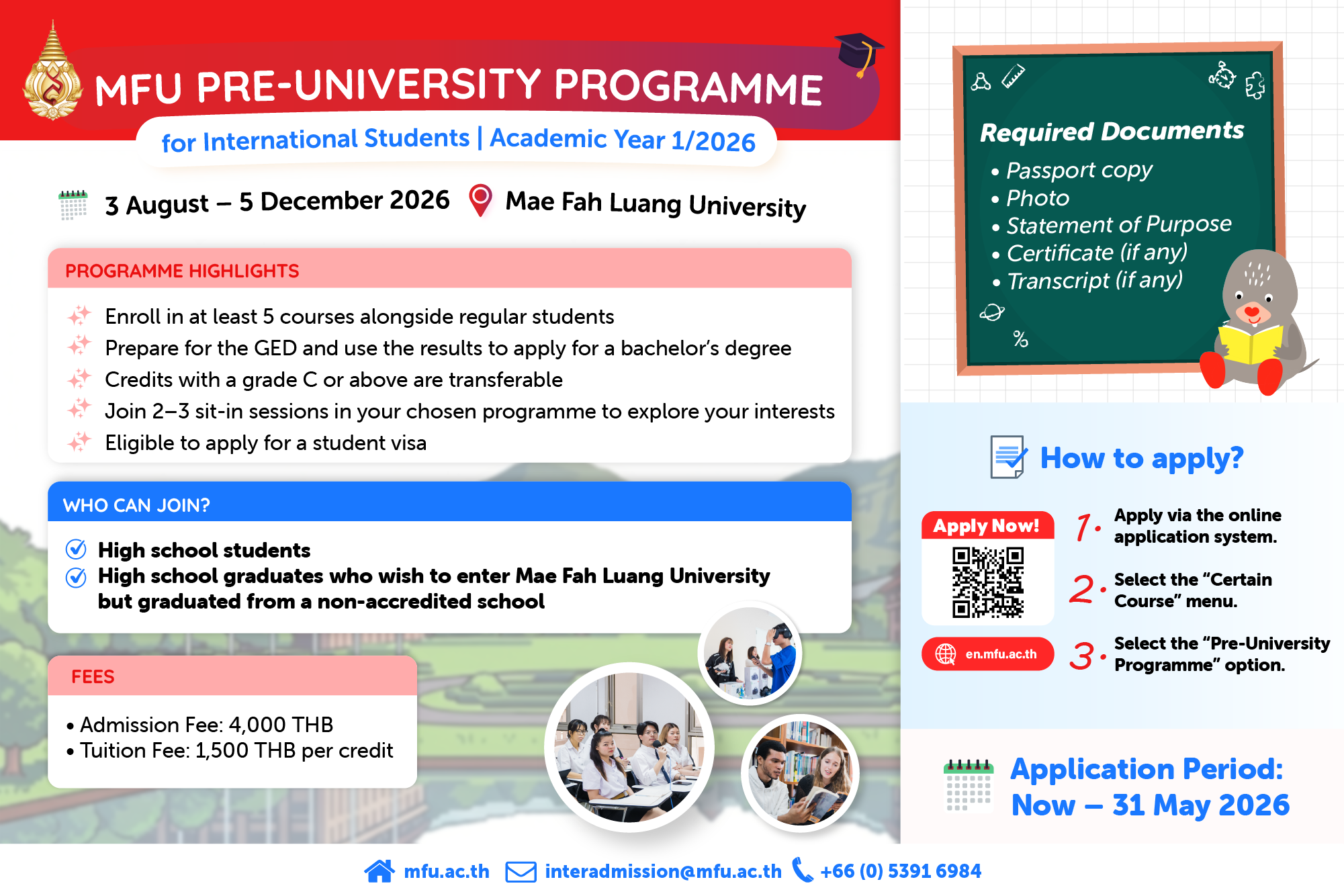 For more information, please contact, Email: interadmission@mfu.ac.th