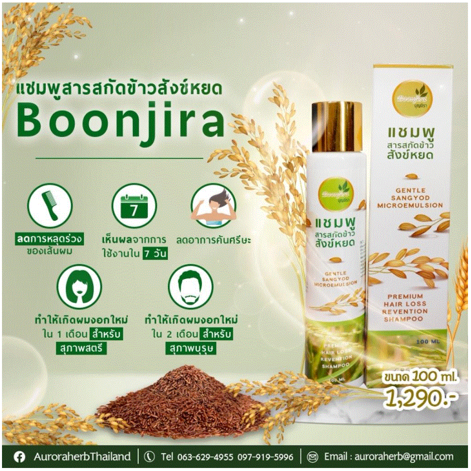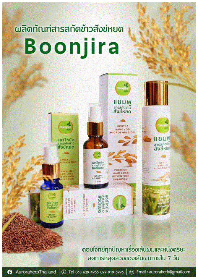 ออโรร่า เฮิร์บ ก้าวไปอีกขั้นเปิดตัวแบรนด์น้องใหม่ Boonjira หรือ บุญจิรา เป็นแบรนด์สินค้าที่ยังคงจำหน่ายสินค้าที่รองรับการดูแลเส้นผม และหนังศีรษะเพื่อให้การพัฒนาผลิตภัณฑ์ดูแลเส้นผมและบำรุงหนังศีรษะมีการพัฒนาต่อยอดผลิตภัณฑ์อย่างต่อเนื่อง Boonjira ได้เปิดตัวผลิตภัณฑ์ใหม่ป้องกันผมร่วงพร้อมกัน 2 ผลิตภัณฑ์หลัก ประกอบด้วยแฮร์โทนิค และ แชมพูสระผม ป้องกันผมร่วง ที่มีคุณภาพมากขึ้นโดยเป็นผลิตภัณฑ์ที่ได้จากงานวิจัย เรื่อง การพัฒนาไมโครอีมัลชันกักเก็บสารสกัดข้าวสังข์หยดเพื่อเพิ่มประสิทธิภาพผลิตภัณฑ์ป้องกันผมร่วง (Development of Microemulsion for Encapsulared Sangyod Rice Extract to Improved Efficiency of Anti-Hair Loss Product)
